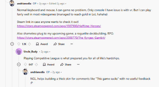 除开游戏设计,安德里还会通过与玩家的互动传递自己的理念。他经常在Discord,Reddit之类的社群网站或软件中与玩家们交流,不仅分享自己的开发经验,还倾听他们的反馈。