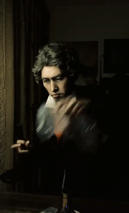 他戴着假发,穿着贝多芬标志性的黑衣白衬红领,在油画质感的光影加持下宛如真人从历史走出一般。